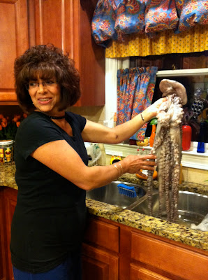 Warning: If you have a weak stomach when it comes to unusual foods, you may want to skip this entry. My mother has been making this salad for as long as I can remember, and it's always been a family favorite. It's just so light and refreshing. For those of you who don't have much experience with octopus- it isn't fishy in flavor at all, so fear not! Last night, my Mother and I teamed up in the kitchen to make this delicious salad!